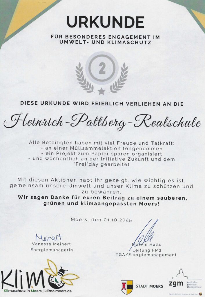 Unsere Schule wurde für die Beiträge zum Klimaschutz im Schuljahr 2024/2025 am 01.Oktober 2025 vom Zentralen Gebäudemanagement Moers (zgm) mit dem 2. Platz beim städtischen Klimaschutzprojekt „KliMo Moers“ ausgezeichnet – und darauf sind wir mächtig stolz! Diese Auszeichnung ist ein großartiger Beweis dafür, wie engagiert unsere gesamte Schulgemeinschaft im Bereich Umweltschutz, Nachhaltigkeit und Energieeinsparung zusammenarbeitet. Unter dem Motto „Kleine Schritte – große Wirkung“ zeigen wir Tag für Tag, dass Klimaschutz nicht nur ein Ziel, sondern gelebter Alltag an unserer Schule ist.