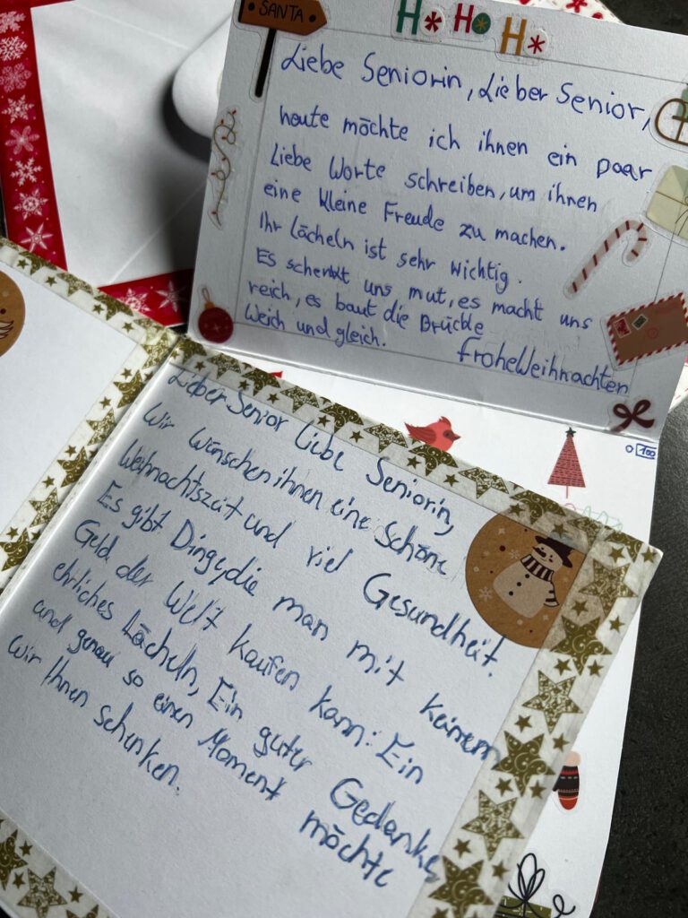 Als die fertigen Umschläge schließlich gesammelt wurden, war der Stolz groß. Denn jede einzelne Karte ist ein Zeichen der Verbundenheit über Generationen hinweg. Die Aktion hat der Klasse gezeigt, wie wertvoll soziales Engagement ist.