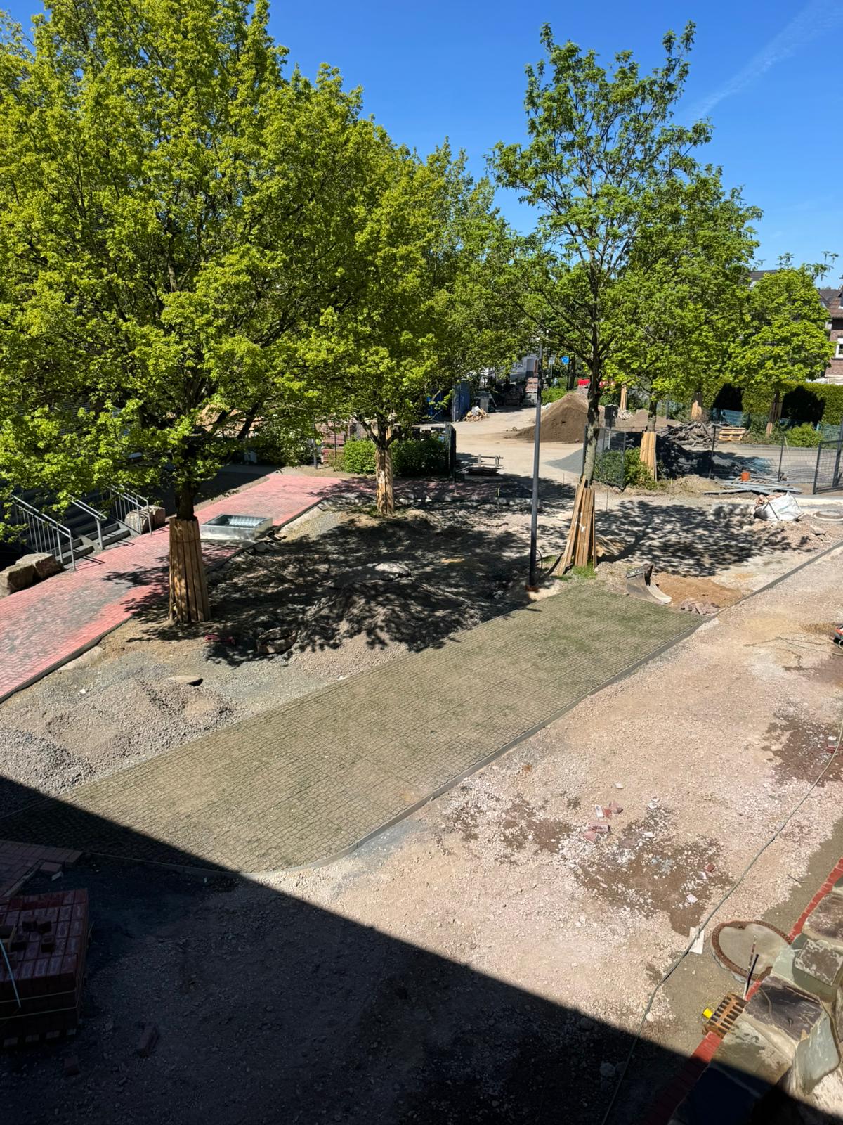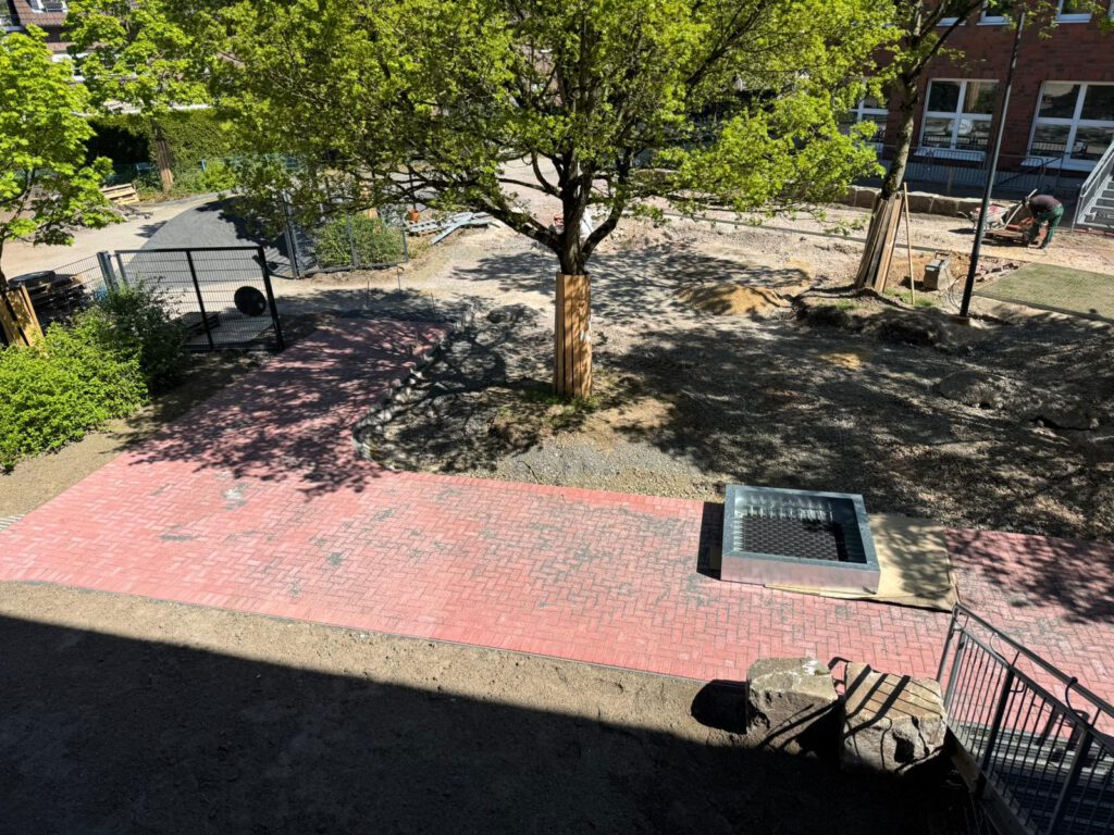 Derzeit wird unser Schulhof neu gestaltet. Auch wenn die vielen kleinen Baustellen den Schulalltag manchmal etwas verändern, wächst hier etwas, auf das sich unsere Schülerinnen und Schüler schon jetzt freuen dürfen. Neue Wege werden angelegt, Flächen werden strukturiert, Grünbereiche vorbereitet und neue Bepflanzungen geplant. So entsteht nach und nach ein Schulhof, der nicht nur schöner aussieht, sondern auch mehr Möglichkeiten bietet: zum Spielen, Bewegen, Ausruhen, Reden und gemeinsamen Verbringen der Pausen.